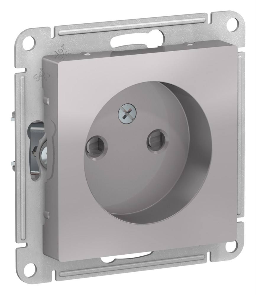 Механизм Systeme Electric (ранее Schneider Electric) серии AtlasDesign в цвете алюминий розетки одинарной без заземления со шторками подходит для сетей 250 В, на ток 16 А.