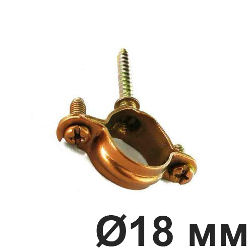 Крепеж для труб, металический, медное покрытие. Используется для труб диамметром 15, 18 и 22 мм. Необходимый размер выбирайте при заказе.