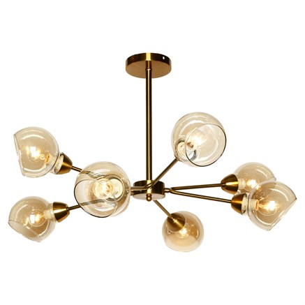 Дизайнерская люстра с янтарными плафонами в виде усеченного шара, повернутых усеченным шаром вниз, создаст теплый приятный свет. Арматура бронзового цвета не будет создавать ярких бликов, что будет создавать спокойную умиротворенную обстановку в помещении.