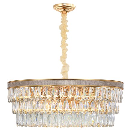Прозрачные подвески, которые в три яруса покрывают люстру по всему диаметру с заужением диаметра вниз. Достаточно выигрышный дизайн для помещений выполненных со вкусом в классическом стиле.