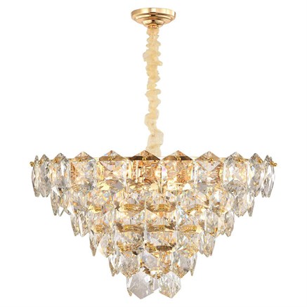 Прозрачные подвески, которые в шесть ярусов покрывают люстру по всему диаметру с заужением диаметра вниз. Такая компоновка дает практически ровный конус. Достаточно выигрышный дизайн для помещений выполненных со вкусом в классическом стиле.