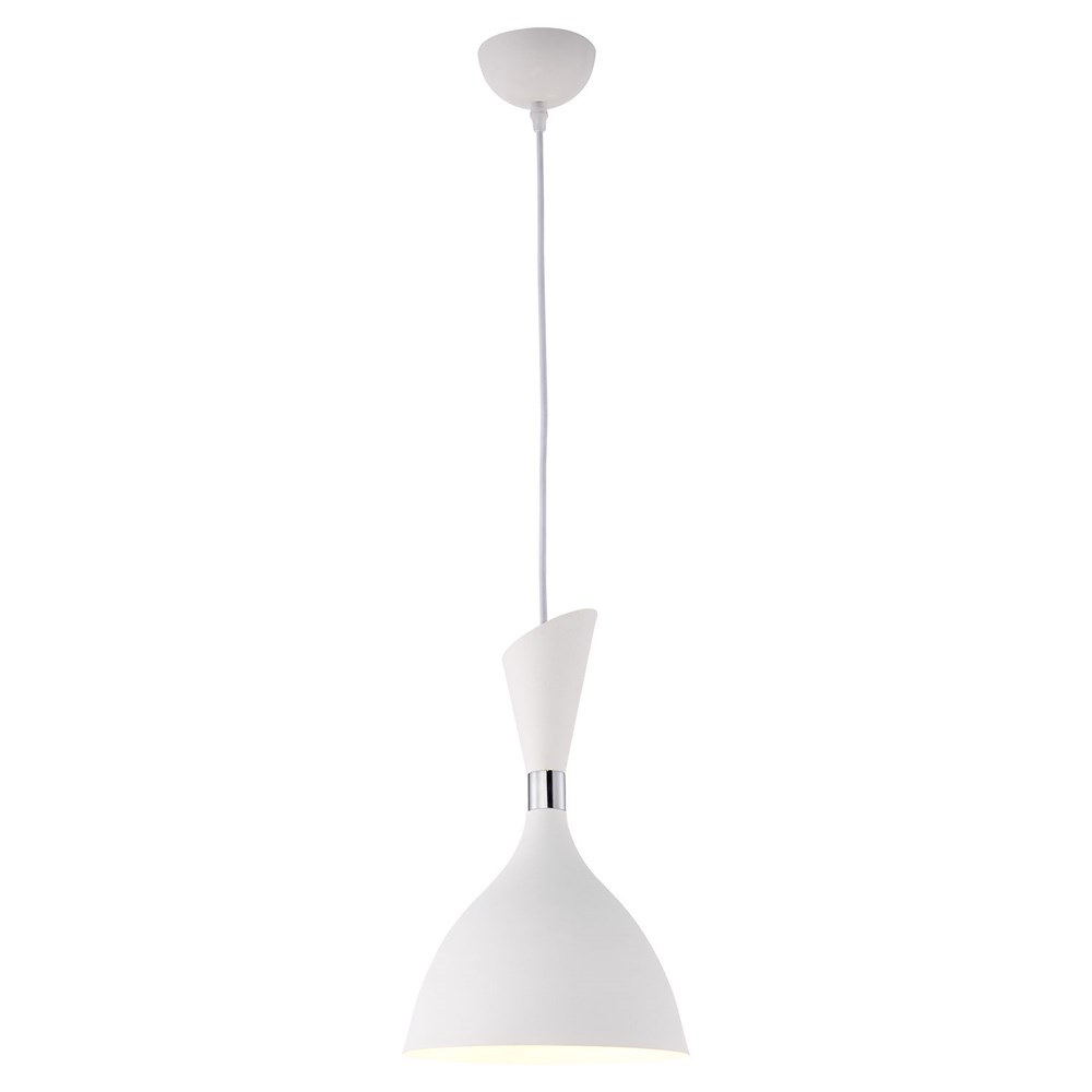 Белый небольшой подвес выполнен из металла, с возможностью изменения высоты подвеса, оснащен цоколем Е27 для применения ламп с высокой светоотдачей. Приталенная форма подвеса не имеет вертикальной симметрии, вверх от талии меньше, а низ больше, также на так называемой талии разместился и так называемый пояс бронзового цвета.