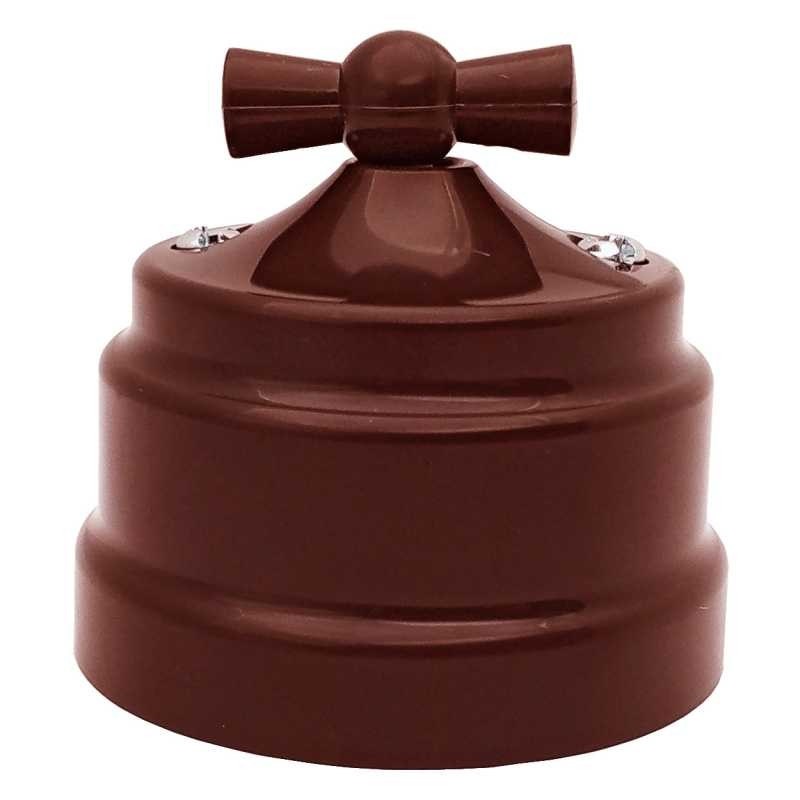Ретро выключатель поворотный, проходной 1-клавишный, пластик, коричневый, Bylectrica А6 10-2296 коричневый. Для установки на ровную поверхность стены и специальные пластиковые подложки подложки.