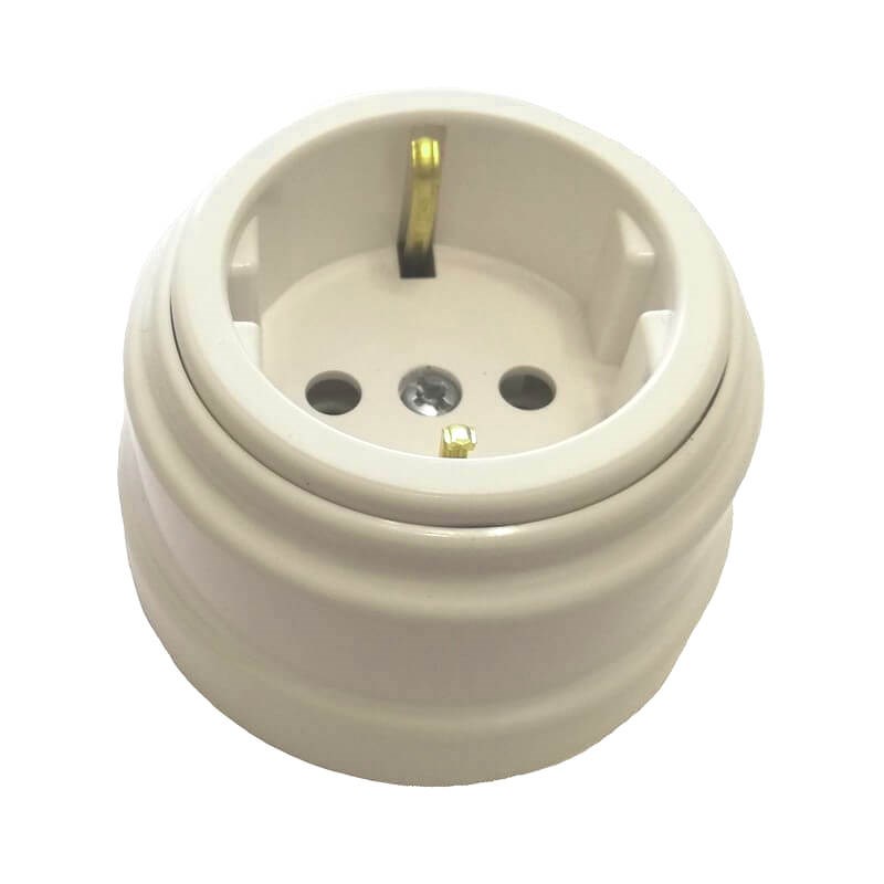 Пластиковая розетка ретро с заземляющим контактом, из АБС-пластика, 16А, для установки на ровной поверхности стены или специальной пластиковой подложке.