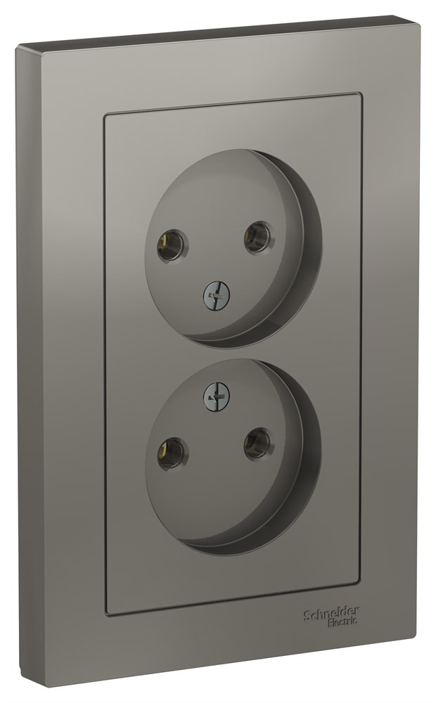 Розетка двойная Systeme Electric (ранее Schneider Electric) серии AtlasDesign (в сборе, цвет сталь) без заземления и без шторок подходит для сетей 250 В, на ток 16 А.