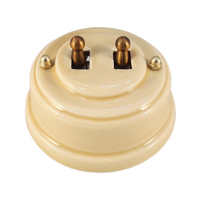 Бытовой электрический двухрычажковый (тумблерный) на два источника света с фарфоровым корпусом песочного (светло-коричневого, бежевого) цвета с металлическими тумблерами бронзового цвета, предназначенный для монтажа открытым способом (наружного монтажа), с одним техническим отверстием для входа провода. Цикл работы стандартный для двухклавишного выключателя: вкл-выкл один источник света плюс вкл-выкл другой источник света. Дно выключателя выполнено из термостойкого ABS пластика, который создает огнеупорную защиту между механизмом выключателя и несущей поверхностью (стеной). Все выключатели сертифицированы и имеют соответствующие сертификаты Таможенного союза. Каждый выключатель упакован в картонную коробку, соответствующую стандартам EAC, со всеми пояснительными надписями.
